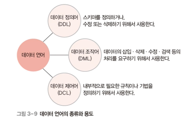 - 데이터 언어: 사용자가 DB를 구축하고 이에 접근하기 위해 DBMS와 통신하는 수단