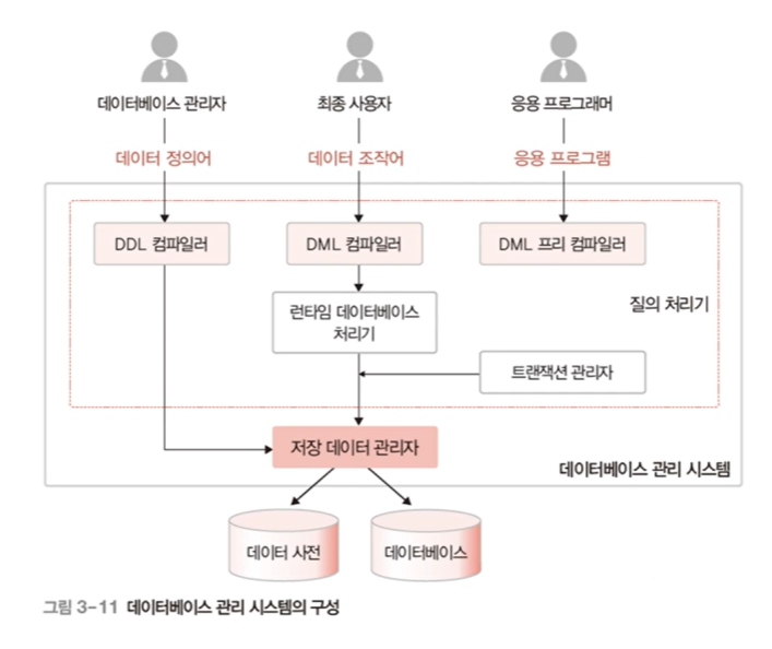 - 질의 처리기: 사용자의 데이터 처리 요구를 해석하여 처리하는 역할을 담당