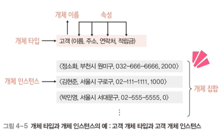 - 개체 집합: 특정 개체 타입에 대한 개체 인스턴스들을 모아 놓은 것