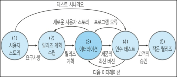 - 문서 중심의 전통적 개발방법이 아닌 필요한 요구를 그때그때 추가하고 수정하는 코드 중심의 점진적 개발방법이다.