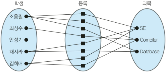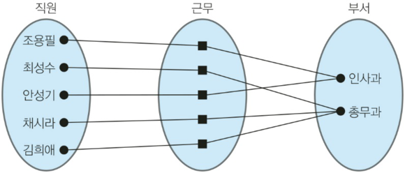 - 관계 : 여러 엔티티 사이에 존재하는 연관성(association)