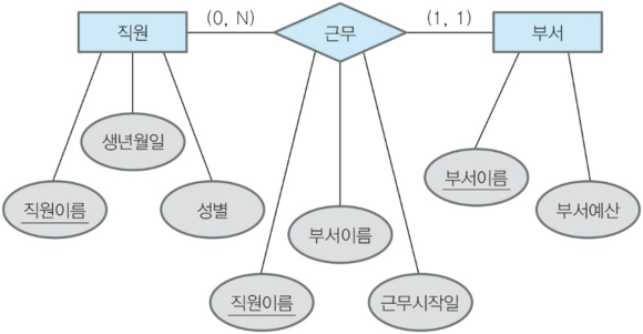 - 참여 제약 조건 (participation constraints) : 한 엔티티가 관계에 참여하는 것이 필수(mandatory)인지 선택(optional)인지를 지정해주는 것