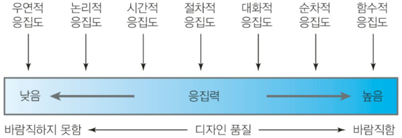 - 응집도(cohesion) : 모듈 내의 구성 요소들이 서로 얼마나 관련이 있는지 등의 연관 정도