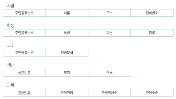 - 각 테이블 = 릴레이션(relation)