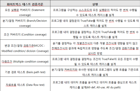 - 화이트박스 테스트 : 내부 코드의 동작 방식에 대한 테스트
