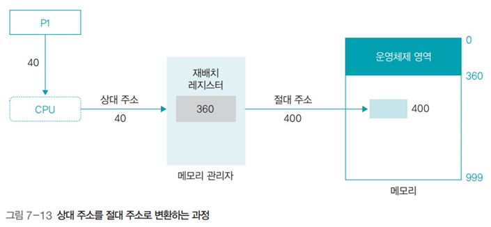 3) 메모리 관리자는 재배치 레지스터를 사용하여 상대 주소를 절대 주소로 변환