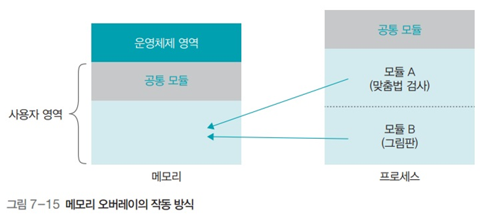 - 메모리 오버레이(overlay) : 프로그램의 크기가 실제(물리) 메모리보다 클 때 전체 프로그램을 메모리에 가져오는 대신 적당한 크기로 잘라 가져오는 기법